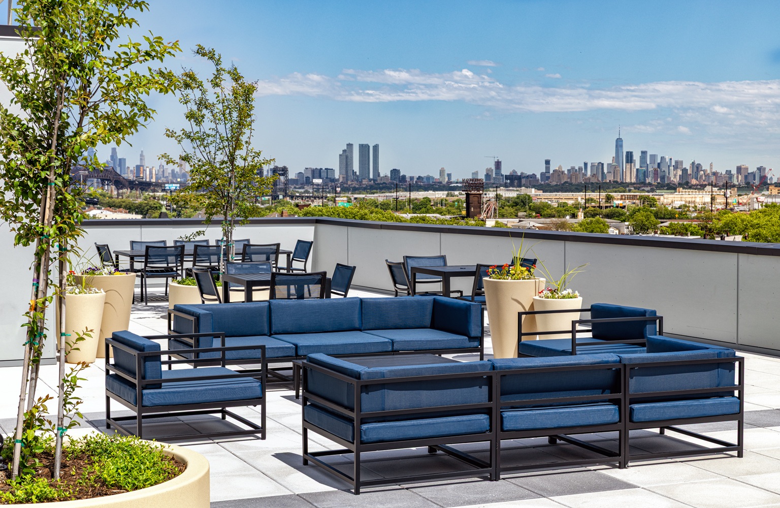 Amenities at The Ballantine are designed to provide a comprehensive and modern lifestyle. The building includes concierge services, a rooftop deck with views of the New York City skyline, a courtyard with BBQs and dining spaces, and a fitness center with a yoga studio. Additional features include a game room with a multi-sport simulator, co-working spaces, a resident lounge, a pet spa, and onsite parking with EV charging stations.