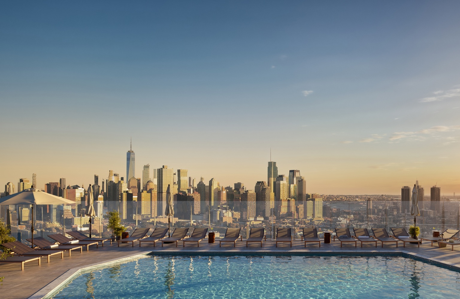 Crowning the 29-story tower is a spectacular rooftop Sky Deck landscaped by Melillo Bauer Carman Landscape Architecture. The showpiece of the roof is the highest swimming pool in Jersey City, surrounded by landscaped observation terraces and outdoor BBQ setups.