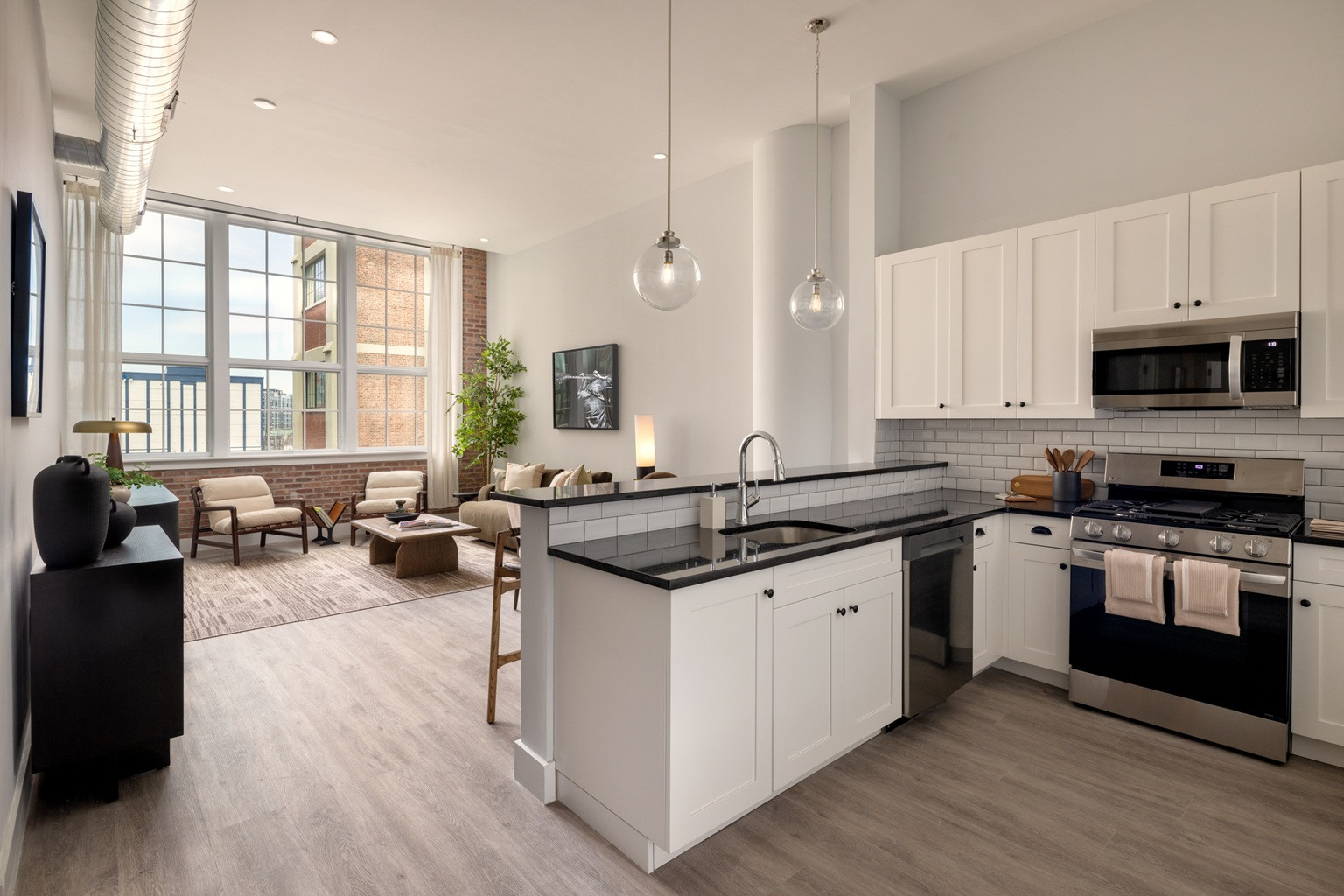 • Soaring Volume: 11.5-foot ceilings paired with exposed brick and oversized windows.
